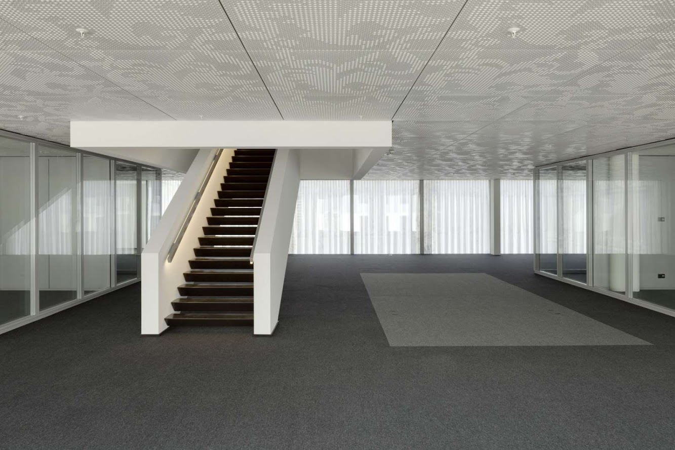 These 1.35 x 1.35 m panels are composed of ‘crumpled’ steel sheets into which a three-dimensional pattern, derived from traditional ornamentation of Swiss chalet eave, has been stamped, which introduces a larger scale to the interior office spaces by decreasing the amount of visible ceiling seams. Micro-perforations in the panels maintain ventilation, allowing for no visible interior air ducts and the placement of an acoustically absorbing sheet on the back of each.