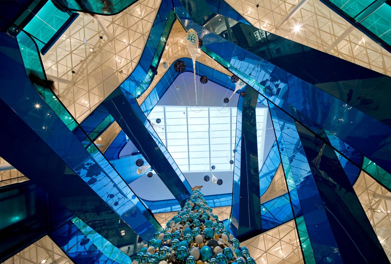 Emporia’s interior challenges established shopping center conventions. Its bold colors and bent sightlines break with the norm, as do the project’s size and ambition—which have made it possible to do custom designs for everything from ceilings, floors, and storefronts to signage, ropes of hanging plants, furniture, and cast glass door handles.