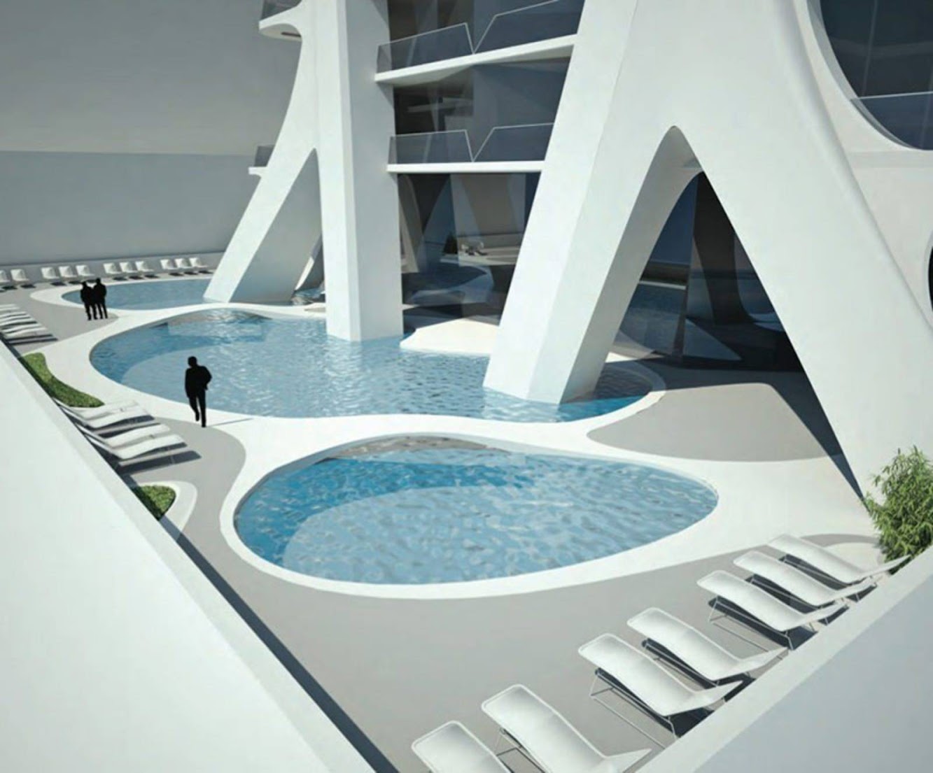 The podium is conceived as a sculptural extension of the tower with the amenity deck design complementing the geometric logic of the exoskeleton. the tower exoskeleton pushes into the podium deck to create pools of water resulting in a rich spatial variety. the pool, landscape and water feature configuration also helps to zone the deck into areas for sun bathing, outdoor grilling and outdoor exercise.