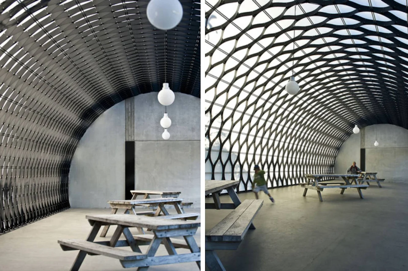 The project is dominated by a 60-foot-long vault made from a lightweight plastic membrane that lets in light in daytime and glows at night. the Wrights took advantage of the long lantern-like building by layering the membrane with a pattern of black metal elements that clearly reference the skin of a snake or lizard.