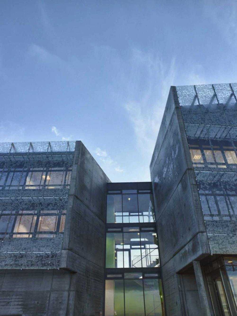 Material palettes are simple and clear. A fritted glass screen envelopes the upper floors, providing a weather shield and supporting the building’s natural ventilation. The glass is fritted with a pattern specially designed for the building; a pattern derived from the familiar formation of ice crystals, which simultaneously diffuses the strict geometry of windows beyond the screen and provides soft shading from low sun angles native to northern latitudes. While transparency and diffused edges define the glass screen, opaque surfaces of exposed concrete frame the glass and provide contrast to its attributes.
