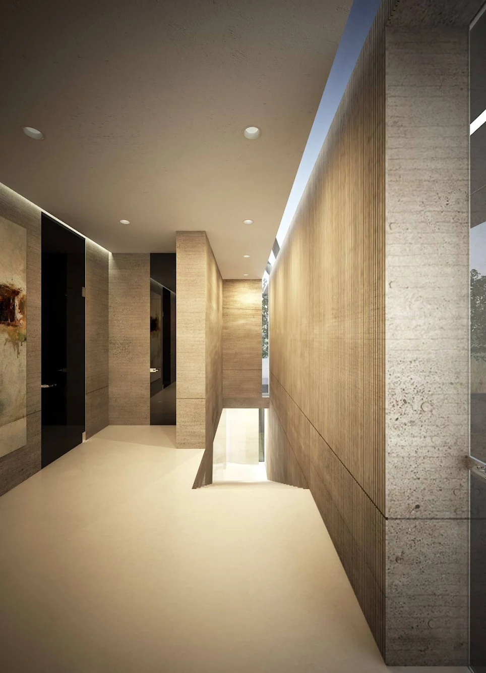 La combinazione dei materiali, con un gioco di vetro e cemento usato sia all’esterno che all’interno della villa, creano un piacevole duelismo di apparenti contrasti.
