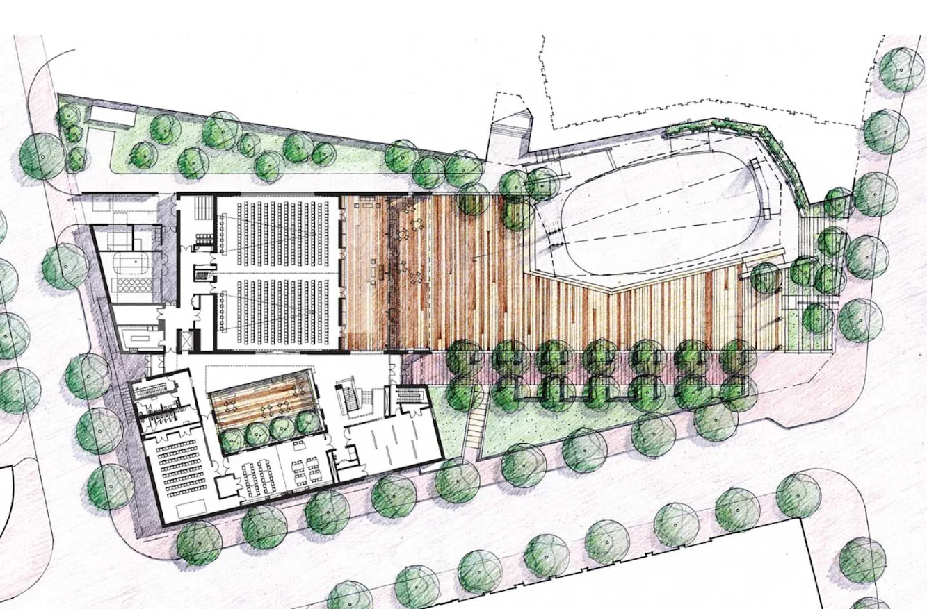An administrative and community wing is located to the west of the circulation spine, housing the SSRC office suite and several community classrooms on Plaza and Upper Levels, with the Round House Theater’s offices and classroom on the lowest level.