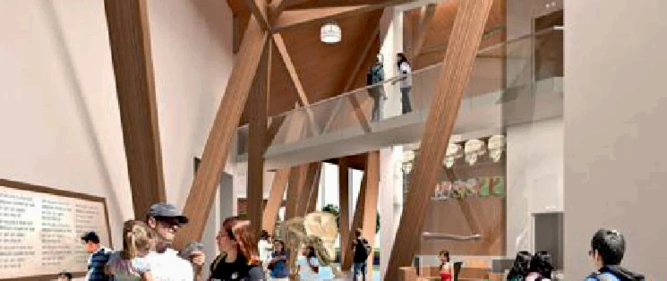 The narrative of the museum parallels the discovery of the bonebed, the paleontological process of reconstructing dinosaurs and the experience of this prehistoric time. the re-erected skeleton of the native Pachyrhinosaurus Lakustai dinosaur will be prominantly featured at the museum entrance. the locally-sourced timber structure and perforated acoustic wood finishes make for a warm yet dramatic sustainable building. Description of Teeple Architects.