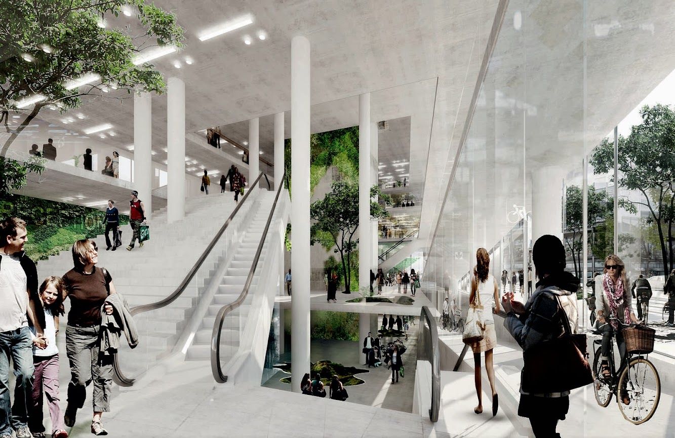 To integrate the office building into the local community at street level, public access is given through an Urban Green Mall, selling healthy quality food and locally produced products. Here, people will meet and interact in the large atria, on terraces, in cafés and restaurants.