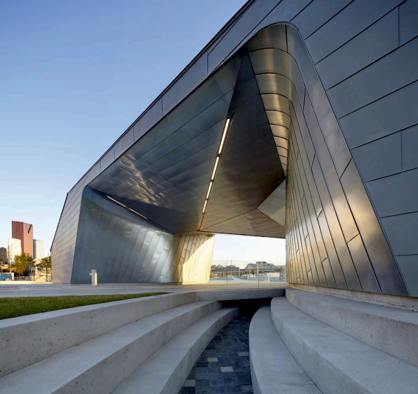Open year-round, the project employs sophisticated rainscreen zinc cladding applied over a steel structure to achieve its complex three-dimensional form. Zinc roofing is also employed as the building is largely seen from above: from new high-rise housing situated around the Park. the exterior surfaces of the pavilion have a soft, patinated texture, while the underbelly is polished, ensuring that the space under the arch is bright and welcoming.