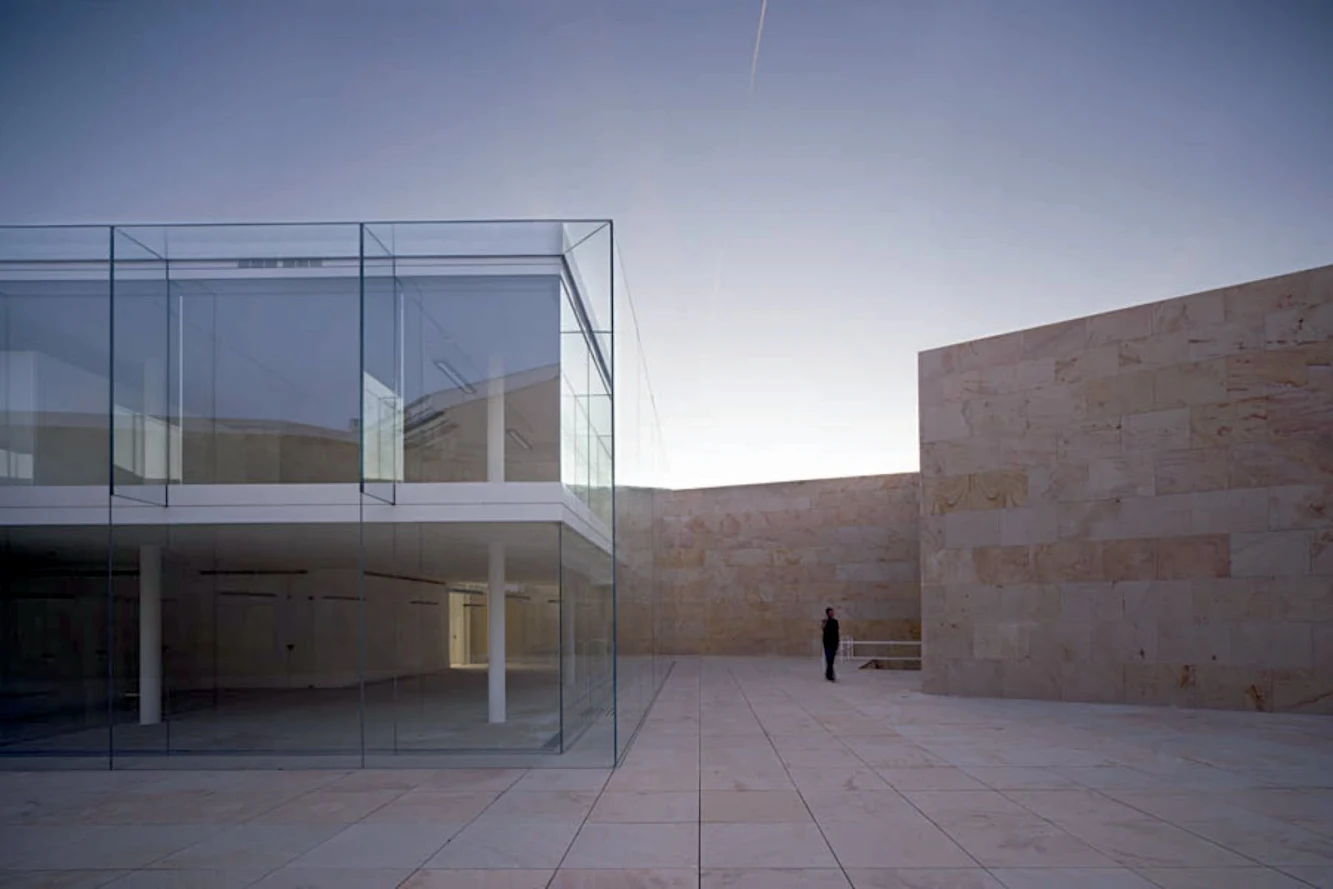 Un muro di pietra segue il profilo del sito e delimita uno spazio in cui è iscritta una scatola di vetro formando due cortili che vengono trattati con un design minimalista contrapponendo muro in pietra a facciate vetrate in un gioco di spazi paragonabile ad un chiostro medievale.