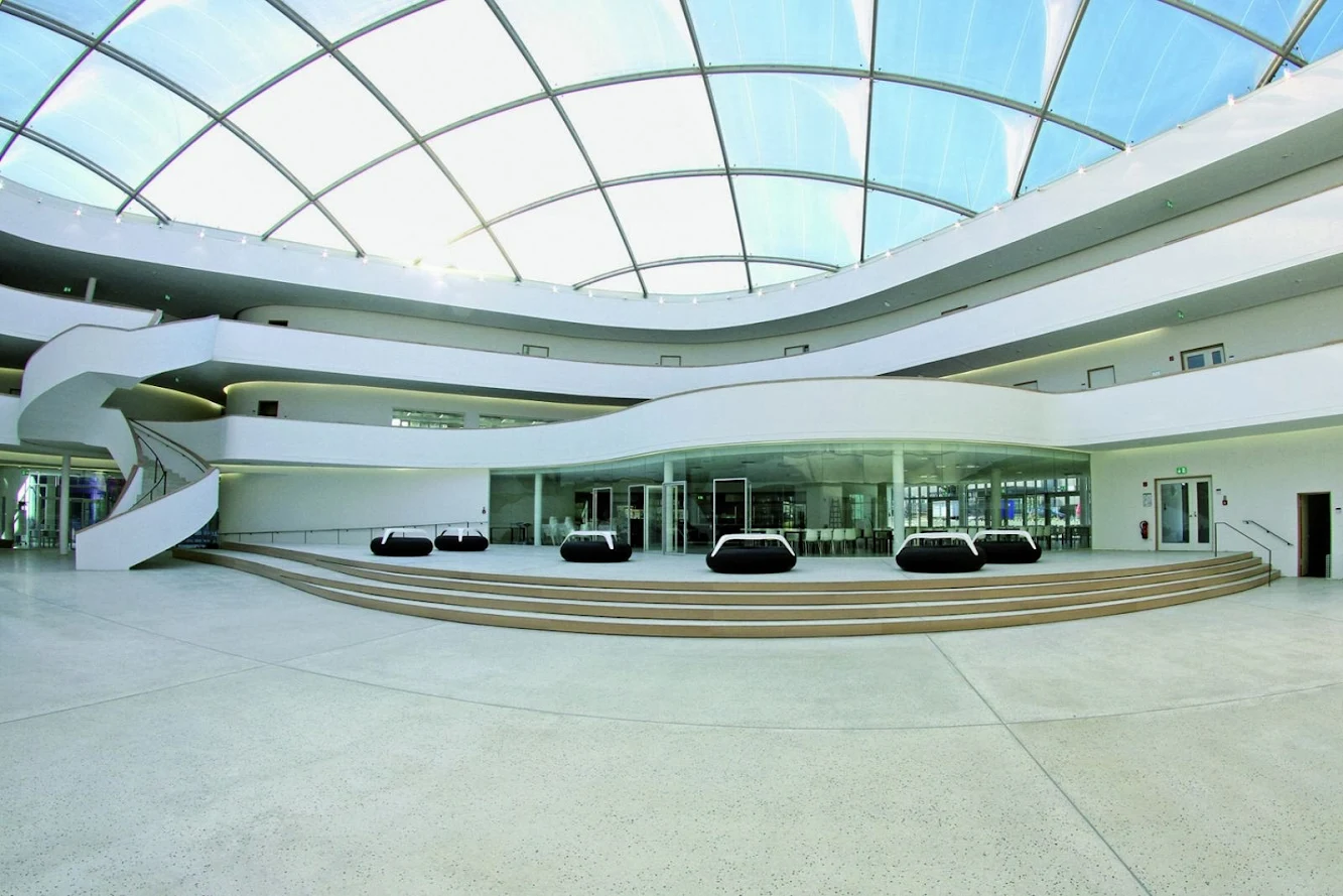 The ‘Neues Gymnasium’ consists of two interlocking three-storey ring-shaped volumes. From the west a spacious glazed entrance leads directly into a multi-storey hall that is illuminated by a translucent, air-cushion membrane roof.