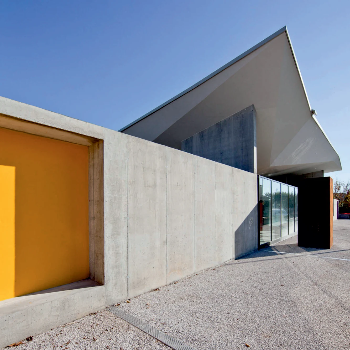 The smaller structures and the back wall of the hall are in raw reinforced concrete. the interior of the hall is covered in composite wooden and cement panels up to the entry door level. the rest is in glass panes assembled on a steel frame up to the roof.