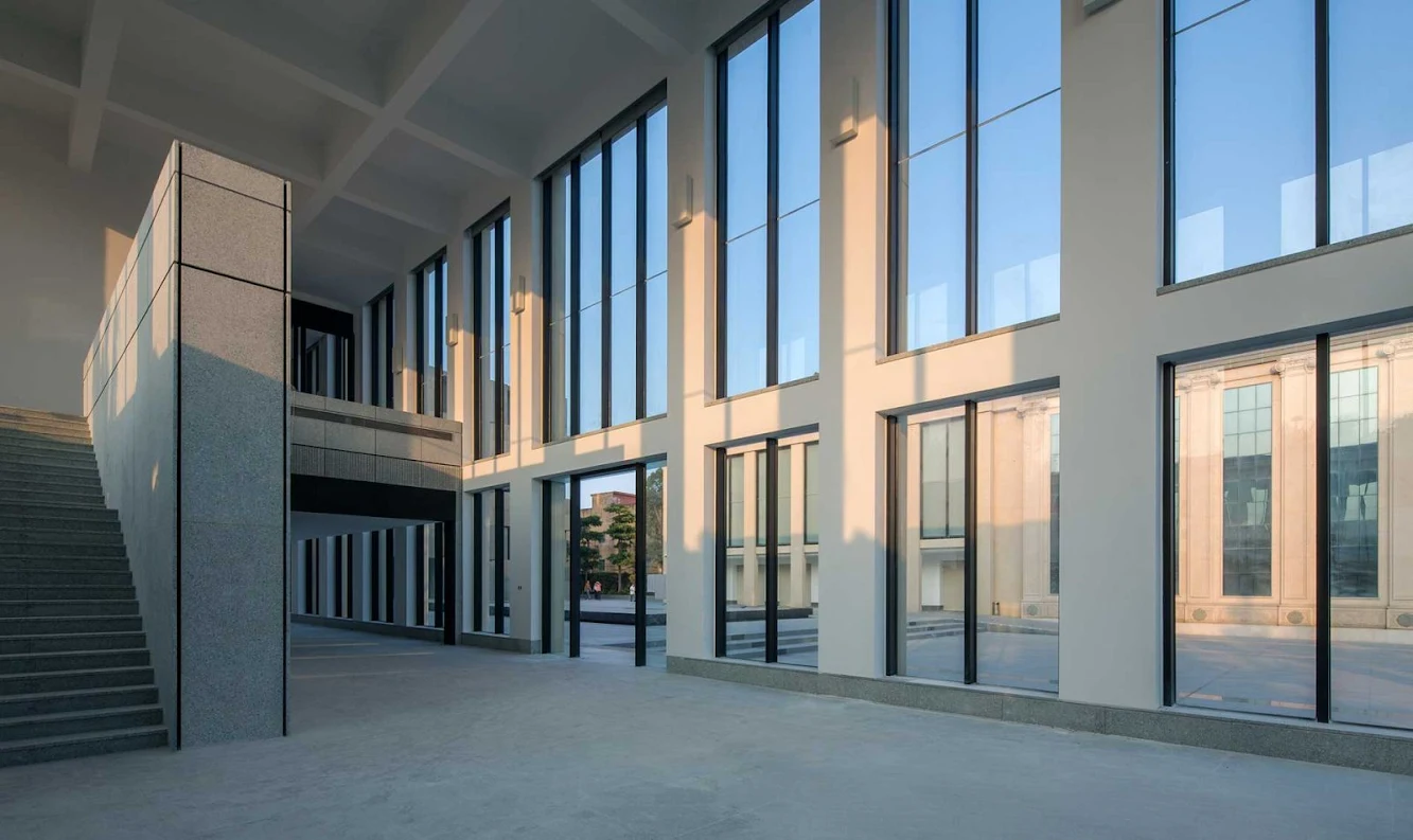 Three buildings has formed a long rectangular entrance square. the building of art museum looks like many huge stones stacking over the other, silent and generous.